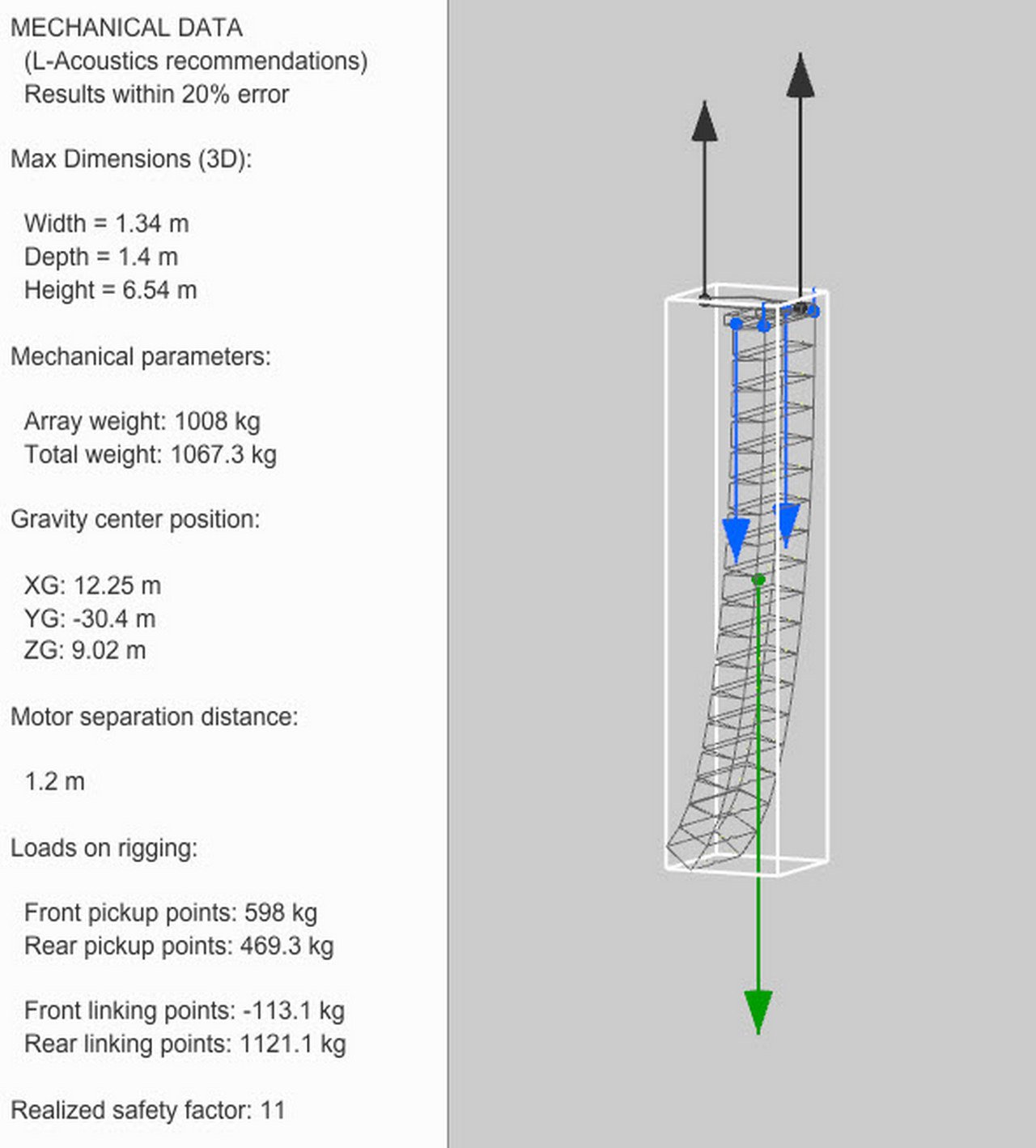 Also very important is the mechanical calculation of the acoustic complex. It allows you to determine the actual load and its distribution over the rigging points and adapt the scheme rigging systems to the existing constructional capabilities of the site. Also, the mechanical check of the elements of the system for the strength and distribution of mass centers is programmed.